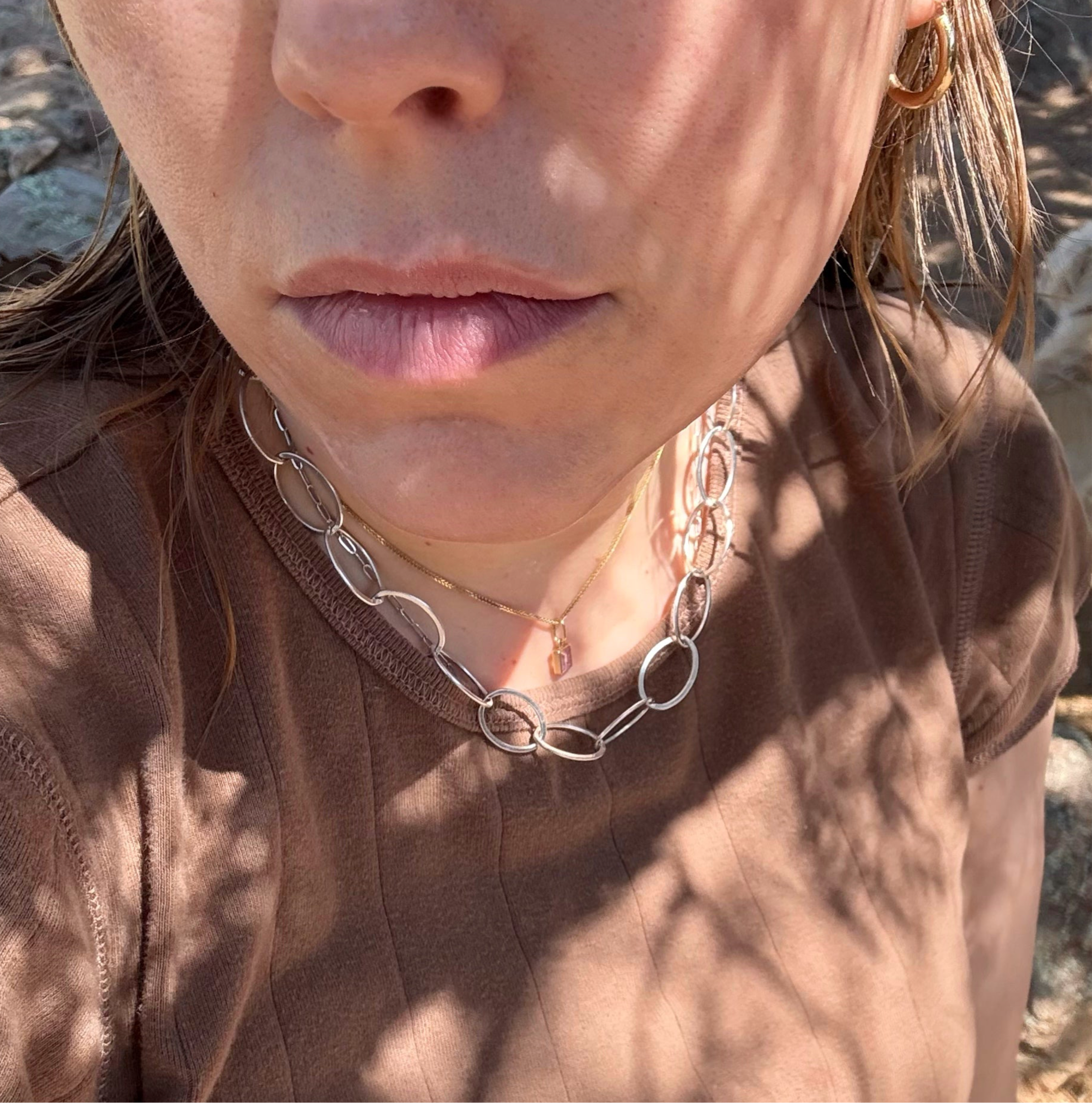 Modern minimalist cable chain necklace in sterling silver. The chain is a 14mm gauge and is 17” long. The clasp is stamped 925 for sterling silver.