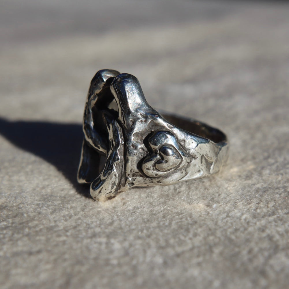 A stunning handmade ring from jewelry maker Jes Maharry, made in solid sterling silver. Designed in a chunky, brutalist style, featuring interlocking horseshoes and double hearts on either side. This is such a unique piece, perfect for that one friend whose style is a little bit southwest, a little bit biker. Inside the ring is hand carved ‘WILD SPIRIT’.