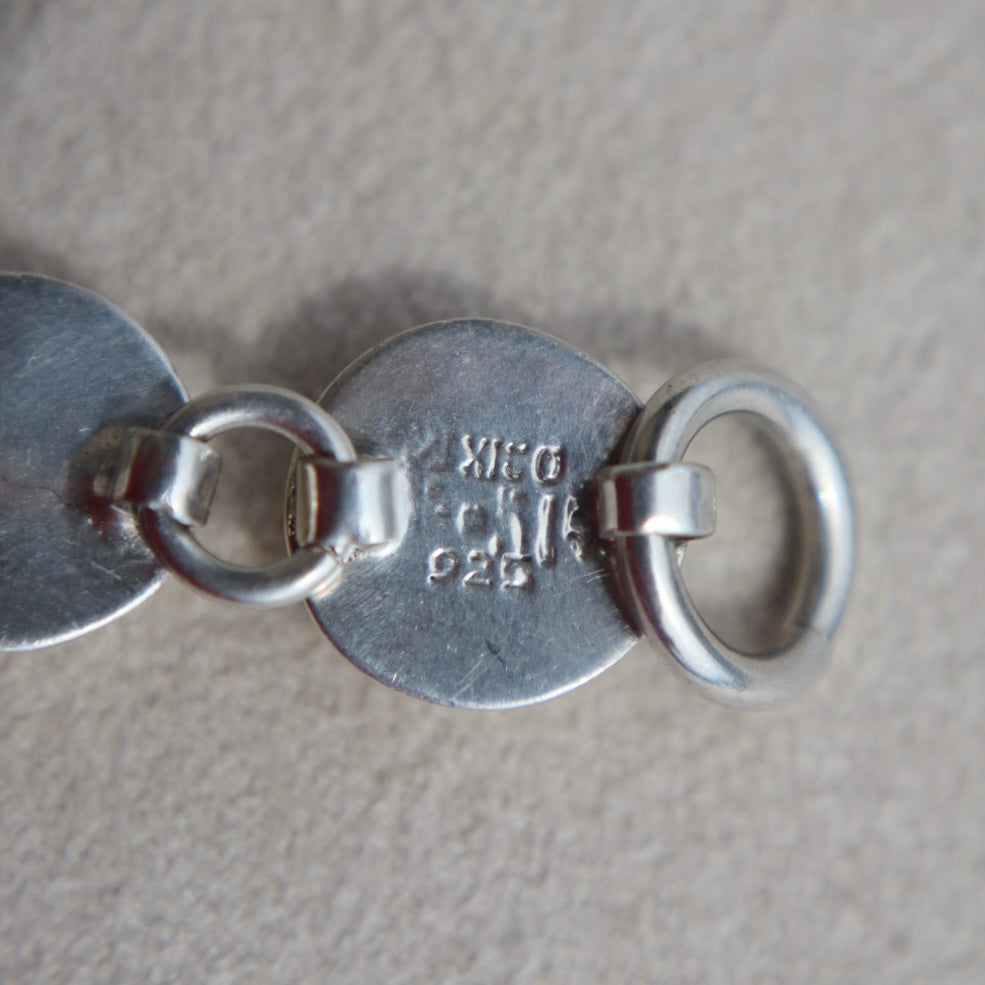 The bracelet measures about 7.5” long. It is stamped MEXICO, along with 925 and a makers mark that’s hard to make out. The bracelet has some minor wear that adds to it’s patina.